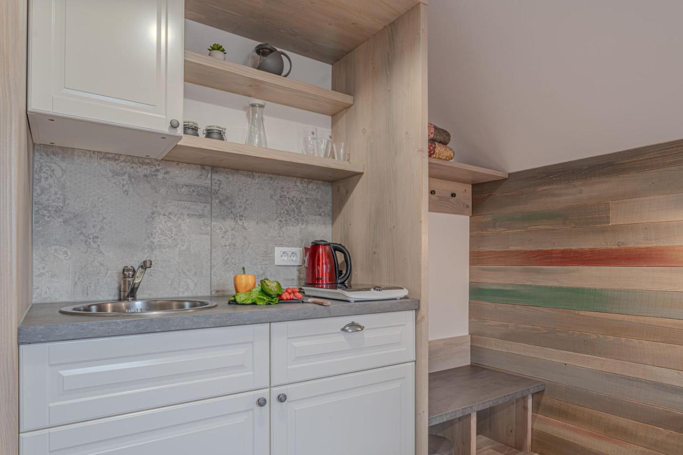 Family Studio. The studio features a private bathroom, air conditioning, a washing machine, as well as a seating area with a flat-screen TV. The kitchenette is equipped with a stovetop, a refrigerator and an electric kettle. This studio provides parquet floors, a TV and an outdoor dining area. The unit offers 2 beds.